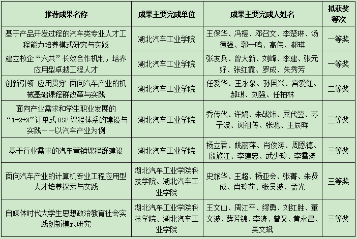 日前,第八届湖北省高等教育教学成果奖获奖名单公布,我校7项教学成果喜获省级教学成果奖,其中省级一等奖2项,省级二等奖1项,省级三等奖4项。由英国威廉集团申报的《基于产品开发过程的汽车类专业人才工程能力培养模式研究与实践》教学成果获得省级一等奖。