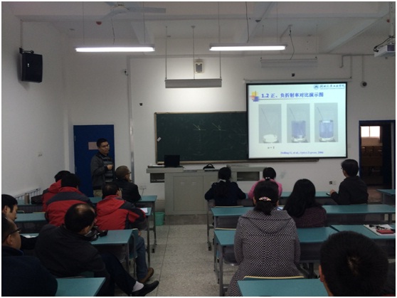 首先,董博士通过一个形象的例子,给大家阐述了什么是“负思维”;之后,针对左手超材料的新颖特性、应用以及分类,让大家对超材料有一些简单的认识;紧接着又通过电影里的一张海报,形象的引入“负质量与负世界”的思维模式;然后,董博士将超材料联系力学,并向大家展示他博士期间做出的超材料薄板,讲述了超材料在力学领域里的研究范围及研究方法以及他博士期间的具体研究工作;最后,展示了他博士期间的部分研究成果。