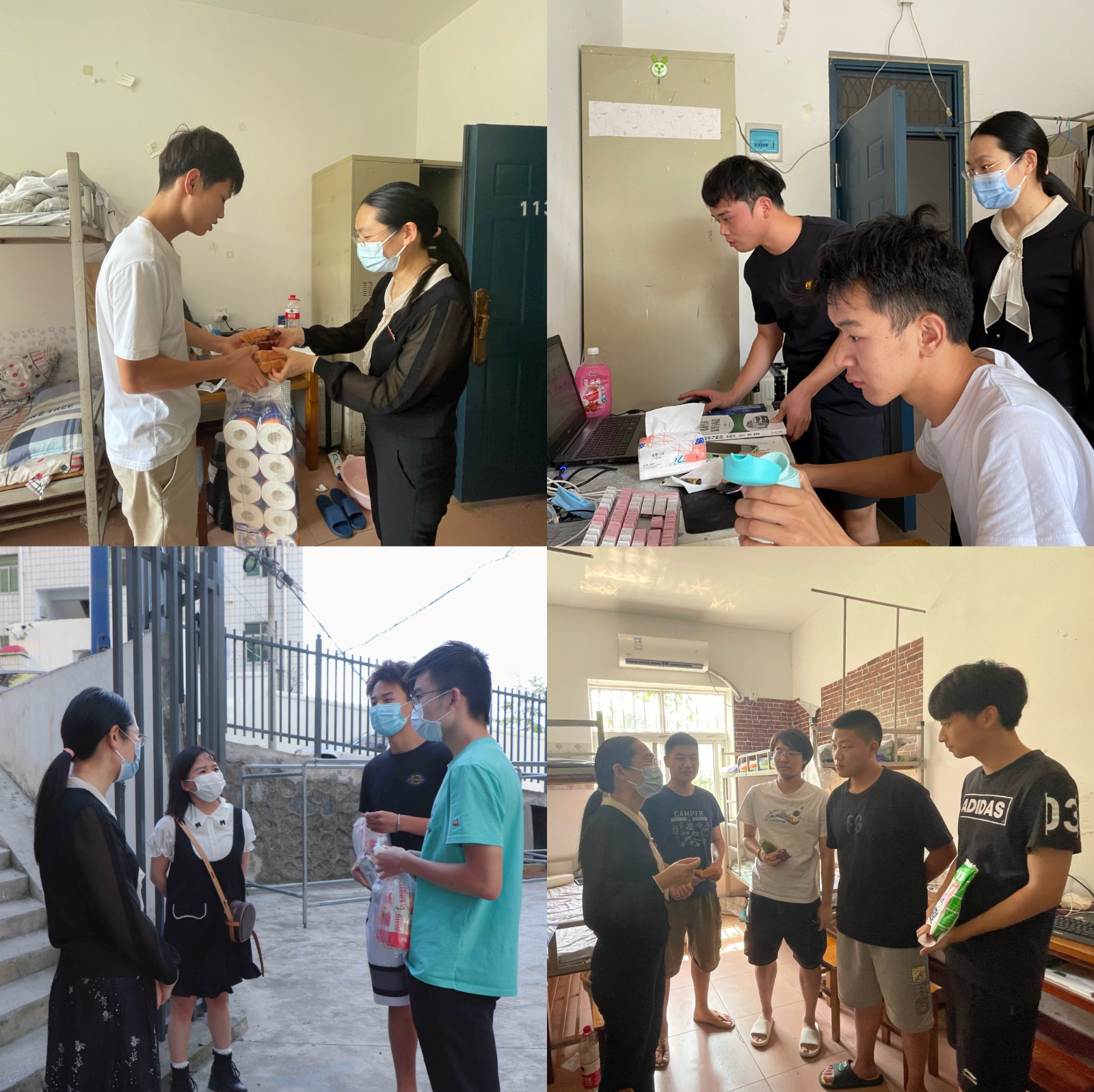 随后,杜昕俊一行人走访了在虹枫宿舍监测点进行居家监测的学生,送上了学院准备的“干粮礼包”,并询问了大家的健康状况和上网课情况。她叮嘱大家在居家监测期间一定要做好防护,戴好口罩,听从安排,要有大局意识,积极配合医护人员完成各项检测任务,并且告诉学生要调整好生活作息,保持良好心态。