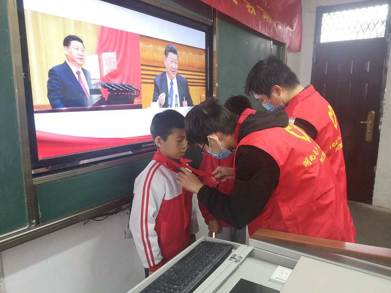 “青春孕育无限希望,青年创造美好明天。”红领巾代表红旗的一角,是革命先烈的血染红的,是少先队员的标志。开课前,志愿者们为小学生们一一佩戴好红领巾,强调了红领巾的重要意义。主讲人带领班级同学集中观看了党的二十大开幕会视频,每位少先队员都挺直腰杆,认真聆听习近平总书记在大会上的讲话精神。随后,主讲人为同学们讲解了关于抗美援朝战争的历史,带领少先队员们追忆那一段段可歌可泣的英雄故事,学习抗美援朝战争中涌现出的团结奋斗、百折不挠、敢于斗争的民族精神,激励少先队员们树立远大理想,争做新时代好少年。