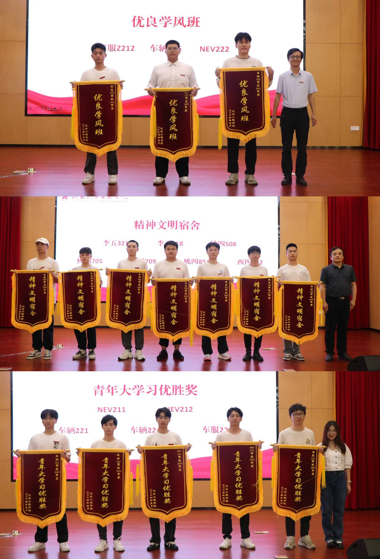 随后,专业优胜奖代表车辆227班吴霜、优良学风班代表车辆225班黄炎凯进行了交流发言。他们从各自的经验出发,分享了学习、生活、实践以及班级建设和管理等方面的心得,并表示愿意继续发挥榜样示范和先锋带头作用引领其他同学。