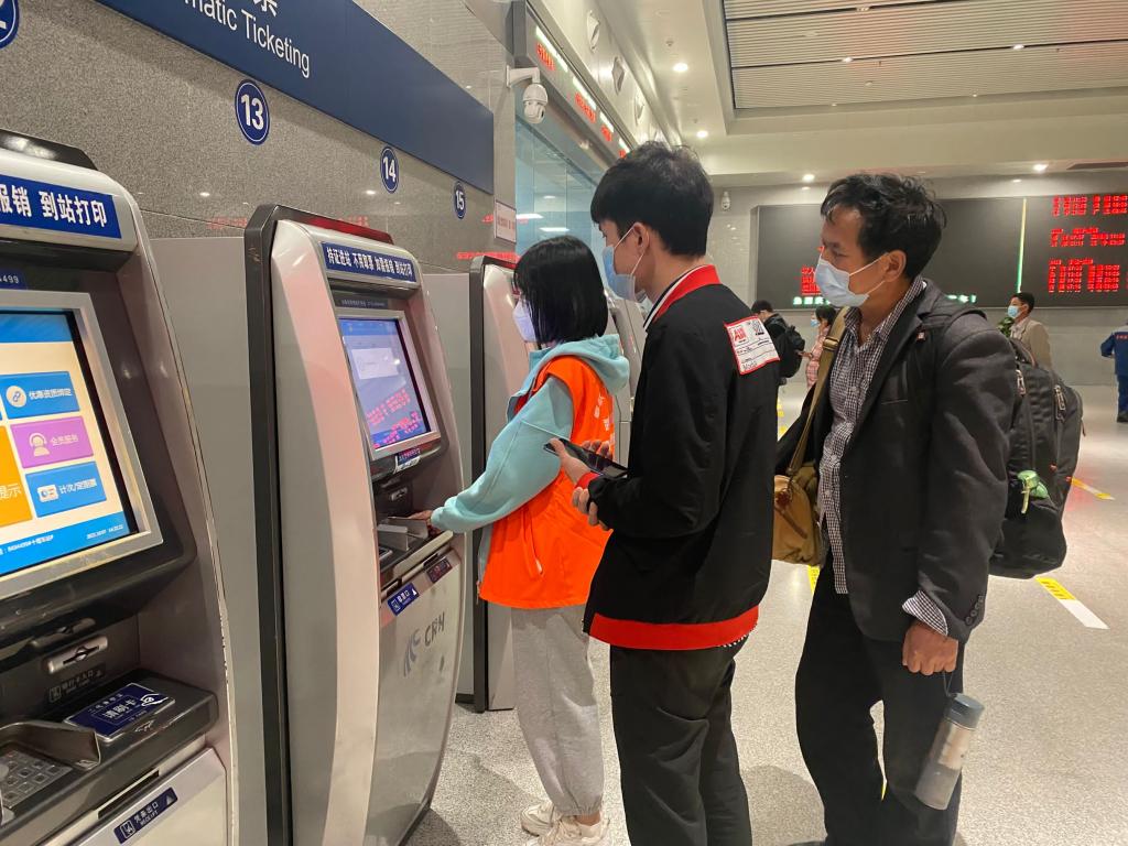 在服务过程中,志愿者们发现部分旅客不会自主使用自动印票机以及购买学生票后无法绑定学生证等问题。因此,志愿者们主动提出在自动售票机和售票大厅旁引导旅客正确取票,确保他们及时登上列车,平安抵达目的地。
