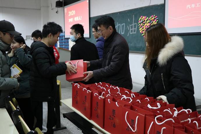 分团委书记胡霄寒主持会议,她首先指出了此次活动开展的目的和必要性,强调了考研对人生发展的重要性,并总体分析了学院近三年的考研和本科就业情况。接着,参会人员集体观看车院考研祝福视频,来自不同年级学弟学妹们的真诚祝福缓解考研学子内心的紧张和不安,伴随着现场的低年级学生们齐声高呼“学长学姐,考研加油!”,考研学子们用热烈的掌声回应了这嘹亮的祝福声。随后与会的老师们还为考研学子一一送上了学院精心准备的“考研加油包”,精美的笔记本、甜蜜的糖果、温馨的祝福卡片、轻便的油笔让每个学生感受到了沉甸甸的暖意,每一句鼓励、每一声叮咛、每一个微笑都像无形的太阳温暖着大家的心田。接受爱心礼包后,车辆176张德俊作代表考研群体进行了简短的发言,表达了所有考研人冲刺的决心和信心。李秀峰在总结中通报分析了今年的报考形势,鼓励大家在严峻的形势中把握住自己的机遇,并谈到“考研的过程就是一个坚持奋斗的过程,道阻且长,只有坚持到最后的才会胜利。剩下不到一个月,无论有任何困难,及时向学院反映,车院永远都是大家最坚强的后盾。我们坚信,你们一定会收获希望,成功上岸!”