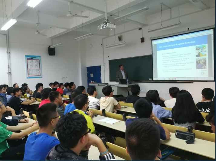 9日晚上,Dr.Schrade教授为我校正在准备赴德学习的2014、2015、2016级学生作了专题讲座,对乌尔姆应用科技大学的地理位置、教育模式、专业设置、教学资源、科研设备和国际合作交流等作了全面介绍。在场学生也纷纷就自己感兴趣的话题用德语与Dr.Schrade教授进行了沟通,为有意赴德学习的学生全面了解乌尔姆应用科技大学创造了一次良好的机会。
