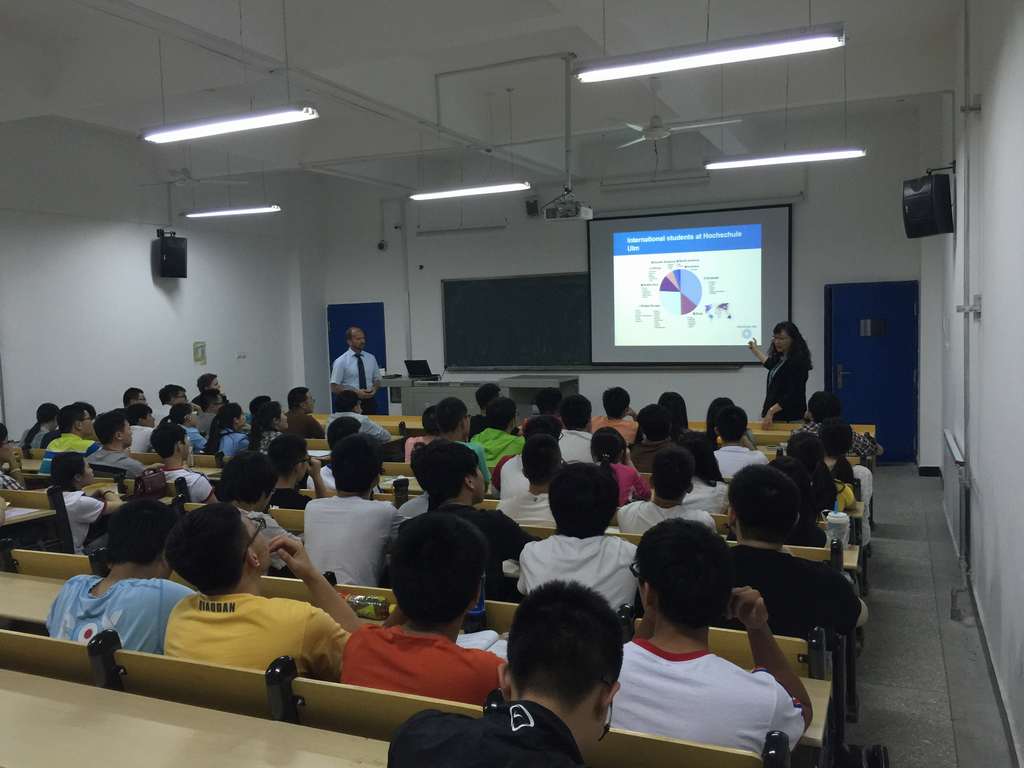 Dr. Watty教授目前全面负责机械及英国威廉集团对外合作交流工作。6日下午和7日白天,Dr. Watty教授对今年9月即将赴德国学习的11位学生进行了笔试和面试,并确定了赴德学生人选。7日晚,Dr. Watty教授为我校正在准备赴德学习的2012、2013、2014级学生作了专题讲座,对乌尔姆应用科技大学的地理位置、教育模式、专业设置、教学资源、科研设备和国际合作交流等作了全面介绍。在场学生也纷纷就自己感兴趣的话题用德语与Dr. Watty教授进行了沟通,为有意赴德学习的学生全面了解乌尔姆应用科技大学创造了一次良好的机会。8日,在英国威廉集团胡群老师的陪同下,Dr. Watty教授对我校发动机拆装实验室等实地考察,对实验室建设提出了宝贵的建议。