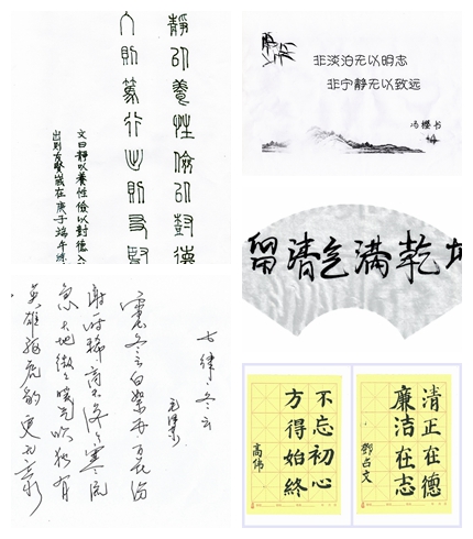 在活动中,党员同志们以习近平总书记重要论述为指导,自行选择了有关廉政、廉洁、爱国、师德等主题的古诗词、现代诗词、散文诗等题材内容,采取硬笔、软笔等方式,着力以文字诠释廉政文化、以诗词表达为师情怀。在教工三支部过双重组织生活的校长钟毓宁同志以小篆字体书写了一幅“静以养性俭以树德,入则笃行出则友贤”,以文表志、以古训今;学院党委书记冯樱专门选取背景纸张,以独有的女性审美视角书写了“非淡泊无以明志,非宁静无以致远”;学院分团委书记胡宵寒以毛笔书写“只留清气满乾坤”,以墨梅气节表达廉者情怀;党委委员韩同群以一幅毛泽东同志的《七律.冬云》表达了对中国人民抗疫必胜的信心;副教授郭一鸣以宋濂的《拟古》表达了“政以廉洁故”的核心理想;邓召文、高伟分别以“不忘初心、方得始终”、“清正在德、廉洁在志”表达了夫妇二人为师树德的信念;副教授吴胜军以“栉风沐雨做园丁、热血丹心育桃李”向党的99周岁生日献礼;能源与动力工程系主任程婷婷用精美纸张书写入党誓词,进行了一次书面的重温誓词;副书记李秀峰以诸葛亮《诫子书》以自勉;学生支部书记李雅琨以一幅娟丽的《爱莲说》诠释了廉与美的内涵;二支部书记樊继东《石灰吟》、《咏史》、《咏煤炭》三首古诗一气呵成,借物喻志;新进博士王东雄工整书写《廉洁如花》散文一首,表达了工科教师内心廉者情怀。此外还有赵慧勇、杨润泽、周吉伟、覃玄、朱政、章菊等党员同志也都以自己独特的视角提交了作品,在一笔一划、回旋勾勒中表达了廉心廉志。