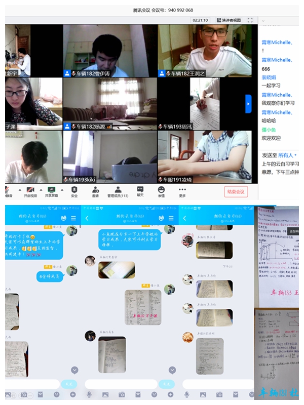 活动将持续一个月直至七月中旬结束,主要目的是帮助宅家学习的同学们建立起良好的自主学习习惯,提高学生的自制力,营造宅家“停课不停学”的学习氛围。学生通过加入“相约云自习QQ群”参加活动,学生会工作人员每天会在群里发布腾讯会议链接,同时会邀请到各个年级学习成绩优秀的学生榜样开视频直播带头学习,并进行互动答疑,帮助大家及时解决学习上的“疑难杂症”。线上云学习结束后,每日会晒出学霸学习笔记,引导学生进行学习打卡,营造浓郁的学习氛围。活动开始的第一天就受到各年级学生的好评,车辆182班的张顺雨作为学霸代表之一,不仅通过云自习分享自己疫情以来的学习方法和心得,还将自己细致精美的课程笔记一一上传共享,迅速获得了一片“粉丝”。车辆193周汛同学说到:“我平时一个人在家,没有学校的学习氛围,平时很难管住自己,学习效率非常低。今天通过腾讯会议视屏直播学习活动,与各年级同学们一起面对面学习,感觉自己又找到了学习的积极性!而且可以与学长学姐交流讨论学习上的疑问,感觉很棒!”