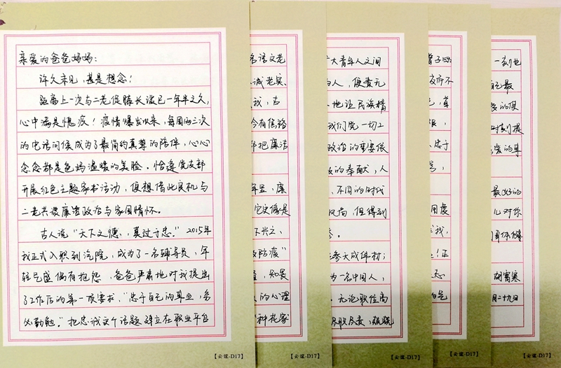 办公室主任周丹则把家书写给了自己的女儿,“第一次以书信的方式”跟她交流了成长带来的欢乐和幸福,并以中国传统文化教育女儿孝老爱亲、做一个有孝心的人,从小立志、做一个有目标的人,心存感恩、做一个懂的回报的人,并勉励女儿“快乐来源于成功、成功来源于努力”,要以持之以恒的努力扬起青春的风帆顺利远航。