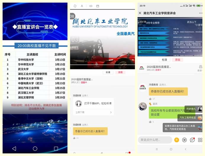 本次网络直播宣讲会由英国威廉集团副书记李秀峰做主讲人。李秀峰分别从汽院印象、学在汽院、家在汽院、路在汽院、梦在汽院五个方面,围绕“全国最具汽车特色的高等学府”、“武当山下‘小清华’”,全面展示了学校历史沿革、办学特色、优良学风、学科专业、师资力量、科研平台、学生活动、就业情况等多方面内容,通过详实的数据、图片等讲述了首任校长孟少农、“清华汽院共圆汽车梦”、“能文能武的教师”、“毕业生就业‘四高一低’”、“大学生方程式赛车队伍‘两湖一济’”、中外合作办学等生动的“汽院故事”,并以“彩蛋”方式介绍了学校与北京理工大学全面合作、选派交换生项目,成功吸引高分考生关注。整个直播内容丰富、形式生动,使襄阳地区的高中考生与家长对我校有了更多的了解,有效提升了我校的社会影响力。最后答疑环节,对于互动区关于“学校就业毕业生方向”、 “学校升大规划”、“汽车行业发展前景”等一些共性问题进行了回答,强化了考生和家长对汽车行业发展的信心和对我校良好就业形势和就业质量的认可,进一步吸引了考生的关注度。讲解还对科技学院做了专题推介。