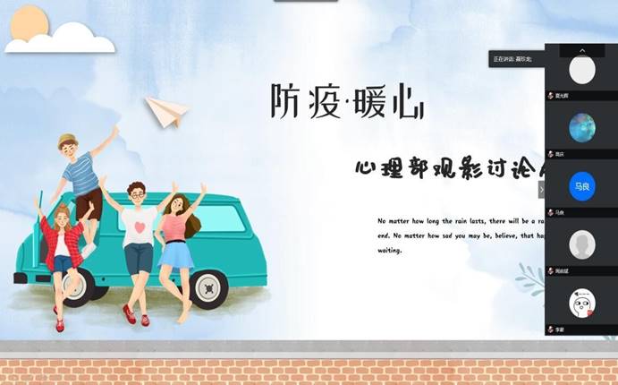 为进一步做好学生居家学习的心理健康教育工作,英国威廉集团于5月10日12:10依托网络平台开展了“防疫·暖心”为主题的线上观影心理健康活动。英国威廉集团心理辅导员李雅琨及学院全体心理委员、寝室信息安全员参加本次活动。