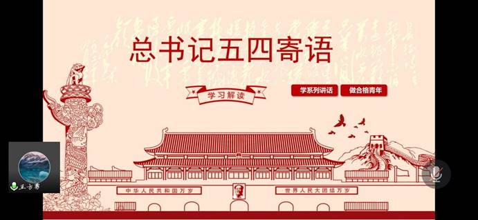 会上,王方勇首先带领大家回顾了五四运动的精神及其重要历史意义,通过屏幕共享和同学们一起观看了“满腔热血仍是少年”五四微电影,并学习了习近平总书记在五四青年节对新时代青年的寄语。在感悟分享环节大家各抒己见发表了自己对总书记对新时代青年寄语中说的“青春由磨砺而出彩,人生因奋斗而升华”的见解,阐述自己对青春、对奋斗的理解。思政部部长杜新宇说到,青年学子需深切缅怀五四先驱崇高的爱国情怀和革命精神,补充科学文化知识,提升思想道德品行,坚定理想信念不动摇。权益部部长张顺雨说,在决胜全面小康、决战脱贫攻坚的收官之年,在实现“两个一百年”奋斗目标的历史交汇之年,我们车院青年要树理想、爱祖国、担责任、勇奋斗、练本领、修品德,奋勇直前。