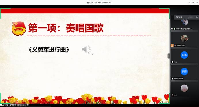 活动在庄严的国歌声中开始,在主持人刘新雨的带领下19级新团员观看了《入团第一课》的视频,让新团员对团支部有了更主观、清晰的了解。接着思政部部长何鸿宣读了新团员名单并由团员代表韩浩天带领新团员宣誓,11名新团员面对团旗庄严宣誓:“我志愿加入中国共产主义青年团,坚决拥护中国共产党的领导,遵守团的章程,为共产主义而奋斗。”青春誓言,高昂雄浑,表达了同学们对共青团组织的无限向往和为团组织增光添彩的豪迈激情。团支部书记代表龚旭宣读了《团章》中有关团员义务和权力的条款,并寄语新团员“要在各个方面提高自身素质和能力,为团支部增添光彩。”
