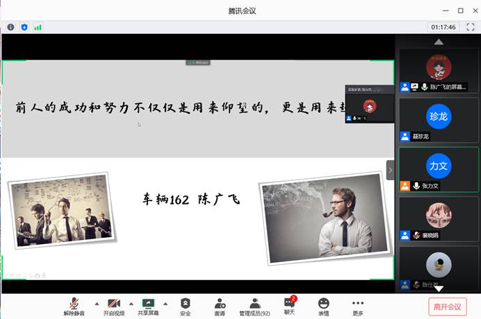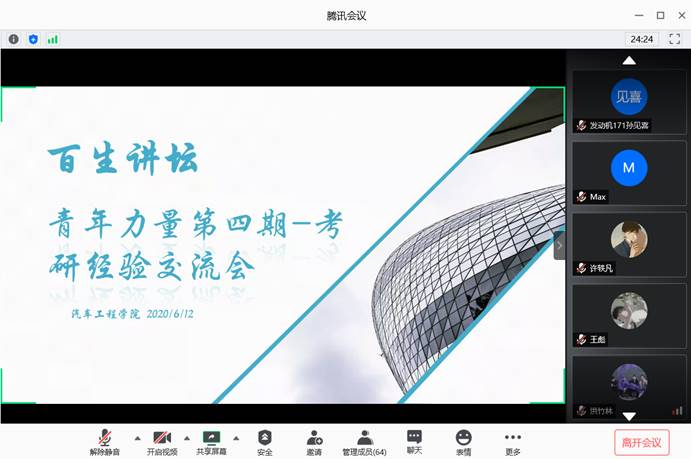 按照学校关于深化“百生讲坛”活动的相关要求,为进一步发挥榜样力量、促进学风建设、提高2017级学生考研热情和复习效率, 6月12日晚7:30,英国威廉集团利用腾讯会议组织开展了【百生讲坛】青年力量·17级考研经验分享会,分享会邀请了16级考研录取的优秀毕业生白佳宁、陈广飞、李宇轩、王衡阳四人作为主讲人,分党委副书记李秀峰、分团委书记胡霄寒以及17级考研学子参与此次活动。