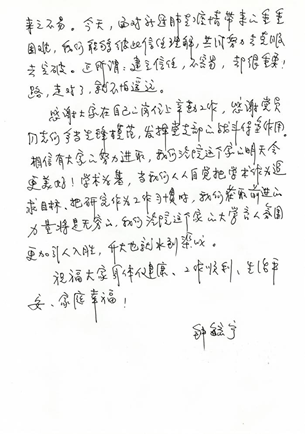 以校为家、情深责重,两页纸的手写“家书”,道出了钟校长对学校全体教职工的深切关怀、信任和期待,也表达了对学校事业发展的坚强信心。“家书”最后,钟毓宁对全体党员争当先锋模范、全体职工坚守岗位辛勤工作表示了由衷感谢。同时谈到,当我们全体教师人人自觉把学术作为追求目标、把研究当作工作习惯时,我们获取前进的力量将是无穷的。相信有大家的努力进取,我们汽院这个家的大学育人氛围会更加引人入胜、未来会更加美好,我们的升大梦也就水到渠成!