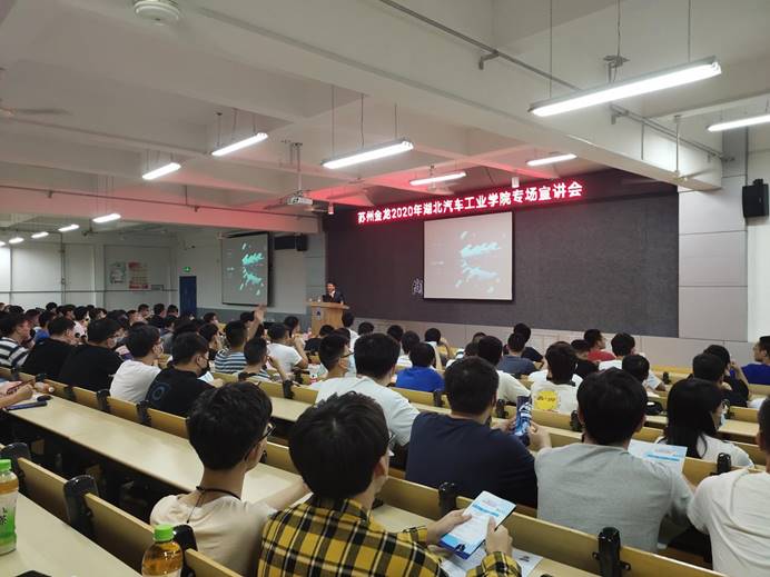 金龙招聘部经理周芃担任主讲人,他结合当前国内的就业形势和政策,对我校毕业生的就业情况做了简单的介绍和分析。随后通过视频宣传片对公司概况、企业文化、员工培养模式、企业的发展状况及前景等方面向学生们做了详细的介绍。他还结合近年来我院被录用学子在企业的优异表现对车辆工程专业的人才培养模式表达了高度的肯定。期间,他特意展示了一段由我院16级毕业生入职后亲自策划录制并配音完成的企业青春宣传片,精彩的画面、专业的剪辑赢得现场一片热烈掌声。他说到,“此次宣讲会除了介绍企业的概括、招聘岗位、用人标准等,还希望宣扬金龙公司的文化和精神。汽院是我们公司的优质合作单位,此次招聘首站就是汽院,这里有我们所需要的综合能力强、技术本领硬、才艺丰富多彩的青年人才!期待更多的有志之士加入金龙!”