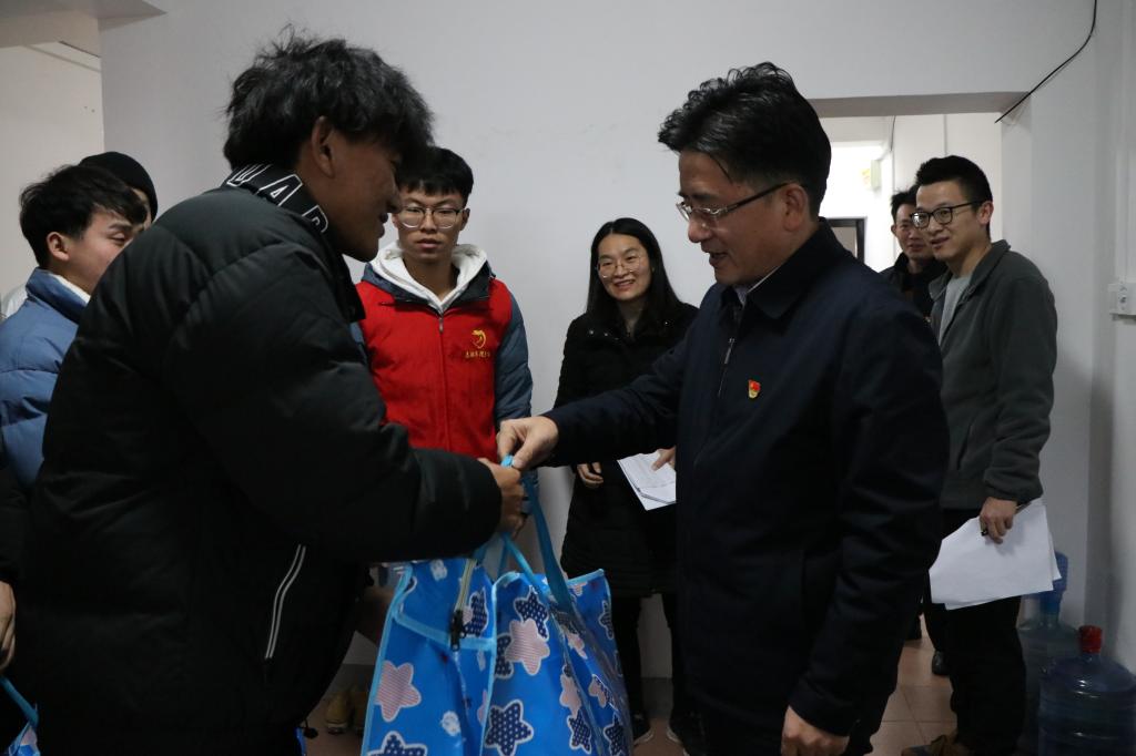 张校长在宿舍与学生们亲切交流,关心了解学生学习和生活状况,并亲手向学生们送上棉被。一床床棉被虽轻,但却饱含着学校领导对同学们沉甸甸的关怀。“宿舍冷不冷?”“伙食怎么样?”“期末复习的怎么样?”每到一间宿舍他都关切的问到。了解到同学们虽然来自五湖四海,但能很和睦相处在一起学习和生活,他感到很欣慰。他还叮嘱同学们在冬季注意保暖,适当锻炼身体,保持良好的卫生习惯。
