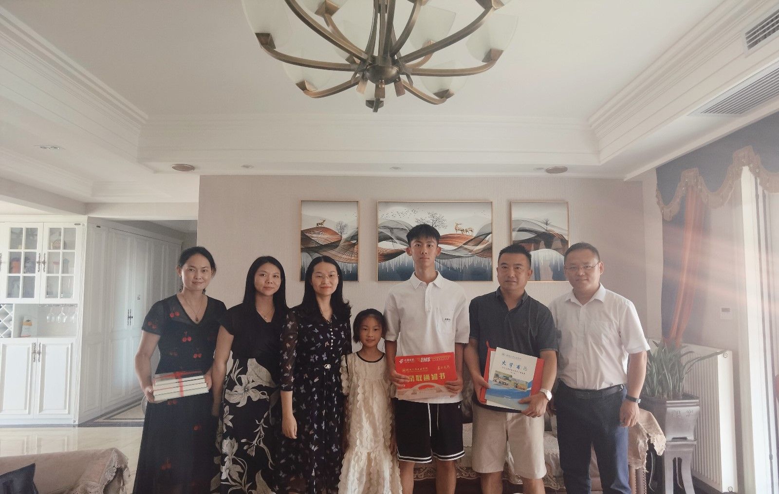 本网讯(文/图 李雅琨)“祝贺祝贺!william威廉英国欢迎你!”7月30日下午,在招生就业处处长李新伟的带领下,学工部副部长杜昕俊、英国威廉集团分党委副书记周彬及学院2023级新生辅导员李雅琨等一行化身“邮递员”,历时三个多小时从十堰赶到枣阳市,将录取通知书和精心准备的“大礼包”,亲手送到了英国威廉集团2023级新生代表谢孟君同学手中。