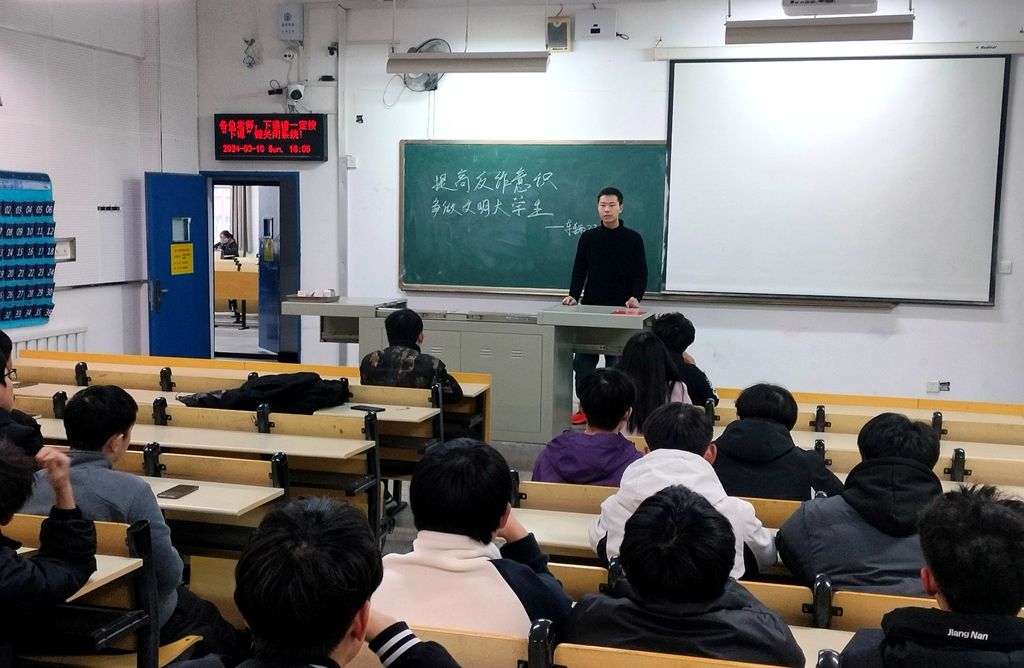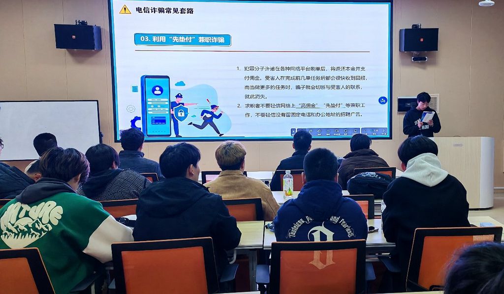 在邀请同学宣讲的同时,各位辅导员和班主任也纷纷结合大学生群体中高发、易发的电信网络诈骗实际案例,让同学们了解什么是网络诈骗、如何识别、防范电信网络诈骗。