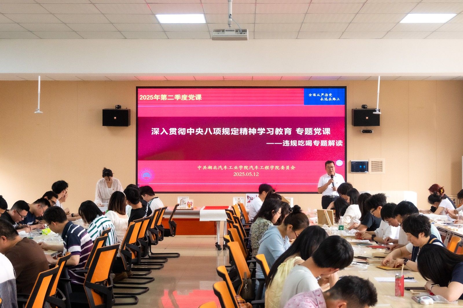 “手工实践是载体,廉洁育人才是内核。”为进一步强化党员干部的廉洁意识,在欣赏完师生们的廉洁作品后,杨亚会围绕“违规吃喝”进行解读,为党员师生讲授专题党课,警示党员师生要做到“心有所畏、行有所止”。杨亚会指出,全体党员要时刻保持清醒头脑,时刻绷紧廉洁自律这根弦,永葆清正廉洁的政治本色。