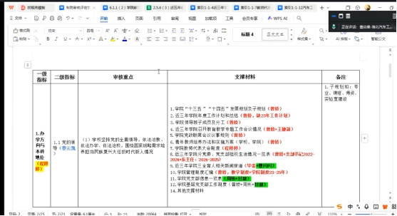 会议首先明确了审核评估管理档案清单的构成,包括七个一级指标、下设的二级指标审核重点及其支撑材料四层文件关系。每个支撑材料文件均有指定的提供,上面的审核重点根据需要设定负责人,二级和一级指标均有负责人。