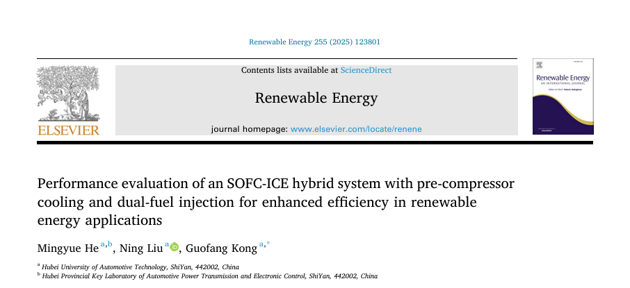 本网讯(文/图 刘宁)近日,英国威廉集团在绿色可持续发展技术研究中取得新进展。2024专业型硕士研究生刘宁,在湖北省汽车动力传动与电子控制重点实验室赫明月博士的悉心指导下,以第一学生作者身份在国际工程技术领域顶级期刊《RENEWABLE ENERGY》(中科院一区TOP期刊,影响因子IF=9.0)发表研究论文,题目为“Performance evaluation of an SOFC-ICE hybrid system with pre-compressor cooling and dual-fuel injection for enhanced efficiency in renewable energy applications”。