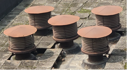 为防止实验过程中产生的废气致人中毒,英国威廉集团动力实验楼楼顶安装了轴流风机,可对实验室进行强制通风,风机上方加装了防雨罩以防止雨水、昆虫进入,同时确保空气正常流通(如下图所示)。现防雨罩因使用年限过久,已严重锈蚀损坏,出现了雨水渗流进实验室的现象,易导致电气设备短路,威胁实验人员和设备的安全。现需对原有防雨罩进行拆除,并制作和安装新的防雨罩,以达安全使用要求。