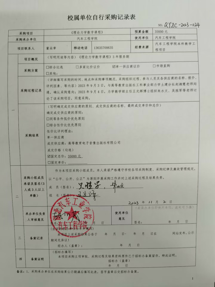 《理论力学数字课程》自行采购公示如上,公示期为:2023年11月2日至2023年11月5日。