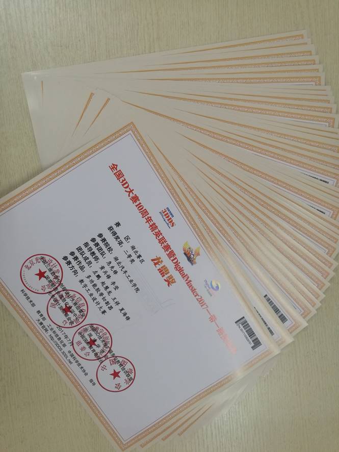 协会参加的比赛有3D大赛、高教杯、华舟杯、挑战杯、机械创新设计大赛。其中3D大赛的参赛方向有数字工业设计、3D打印、逆向设计等等。在2017年的3D大赛中获得国家一等奖一项、国家三等奖一项、省一等奖1项、省二等奖5项、省三等奖6项。图二团队成员于2017年12月5日至9日在云南玉溪参加第十届全国三维数字化设计大赛。图三为团队成员在一带一路十周年精英联赛中的获奖证书。